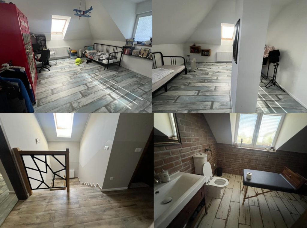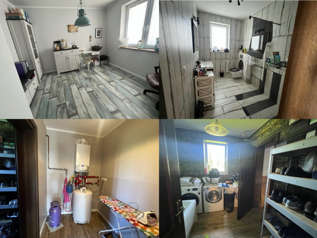 Nieruchomość zabudowana budynkiem mieszkalnym jednorodzinnym, wolnostojącym. Budynek parterowy z poddaszem użytkowym, niepodpiwniczony. Budynek wybudowany w 2010 r., wykończony w 2016 r. nie okazano pozwolenia na użytkowanie ani innych dokumentów dotyczących budynku. Na parterze znajdują się pomieszczenia o funkcji mieszkalno-gospodarczej, na poddaszu pomieszczenia o funkcji mieszkalnej. Budynek o konstrukcji tradycyjnej, murowanej. Dach o konstrukcji drewnianej, kryty dachówką. Elewacja ocieplona, pokryta tynkiem. Budynek w stanie wykończonym. Kuchnia w stałej zabudowie. W salonie znajduje się kominek. Drzwi wejściowe antywłamaniowe. Brama automatyczna.