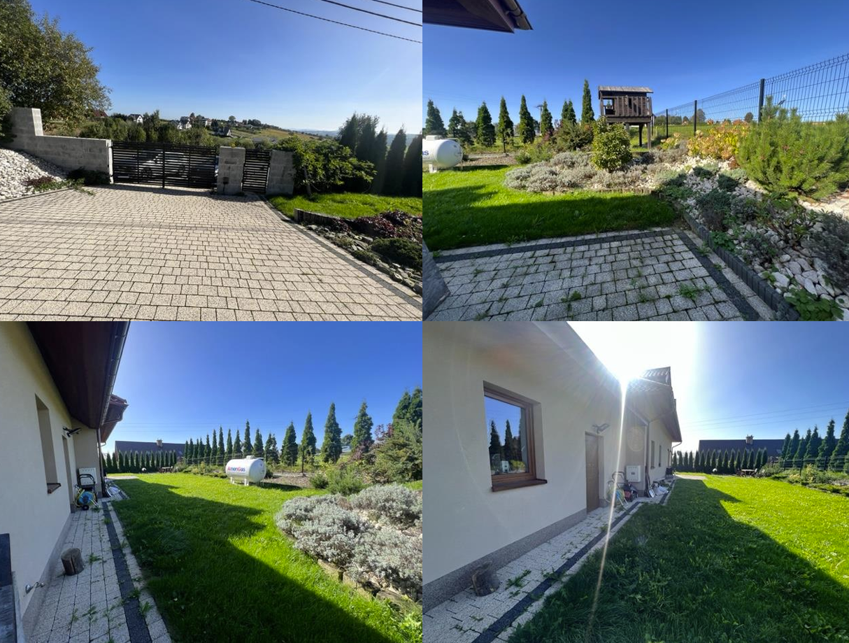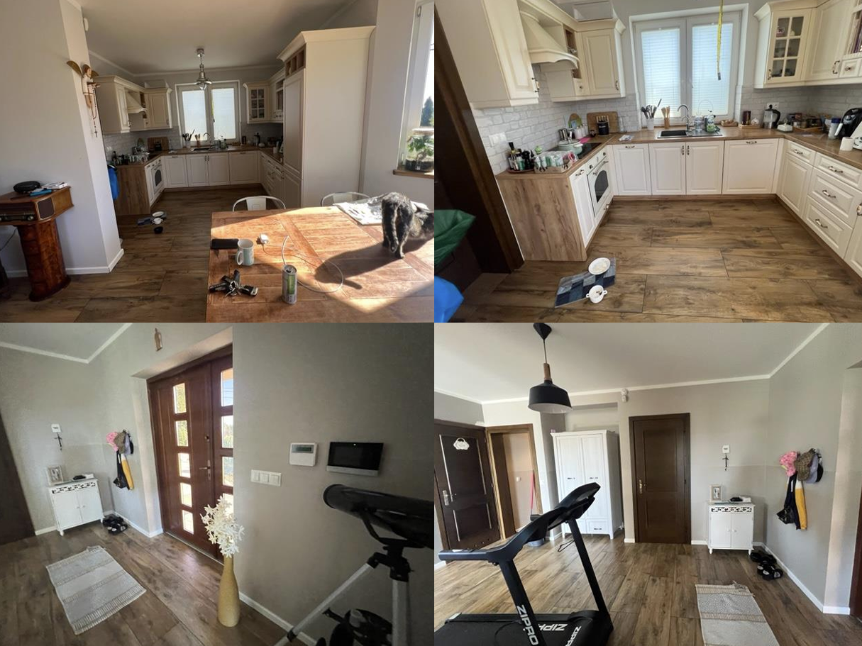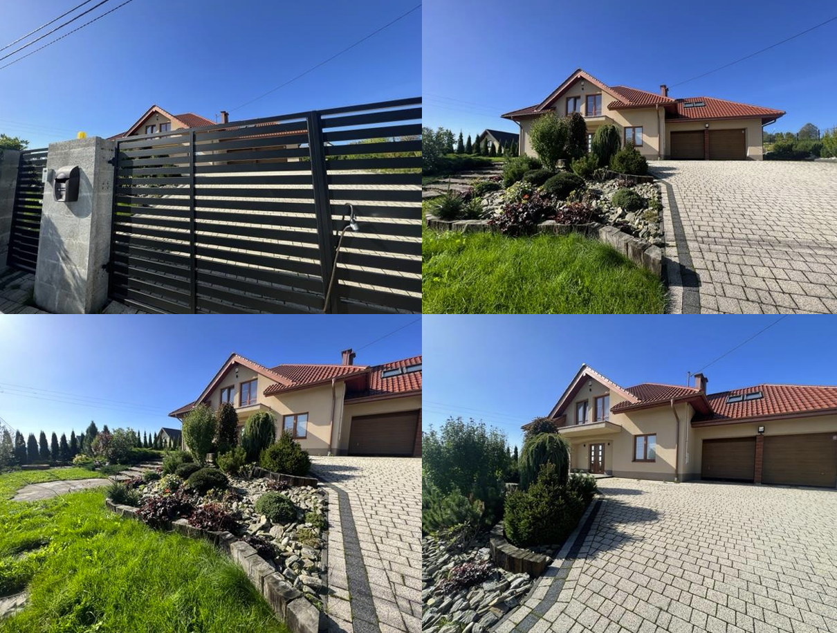 Nieruchomość zabudowana budynkiem mieszkalnym jednorodzinnym, wolnostojącym. Budynek parterowy z poddaszem użytkowym, niepodpiwniczony. Budynek wybudowany w 2010 r., wykończony w 2016 r. nie okazano pozwolenia na użytkowanie ani innych dokumentów dotyczących budynku. Na parterze znajdują się pomieszczenia o funkcji mieszkalno-gospodarczej, na poddaszu pomieszczenia o funkcji mieszkalnej. Budynek o konstrukcji tradycyjnej, murowanej. Dach o konstrukcji drewnianej, kryty dachówką. Elewacja ocieplona, pokryta tynkiem. Budynek w stanie wykończonym. Kuchnia w stałej zabudowie. W salonie znajduje się kominek. Drzwi wejściowe antywłamaniowe. Brama automatyczna.